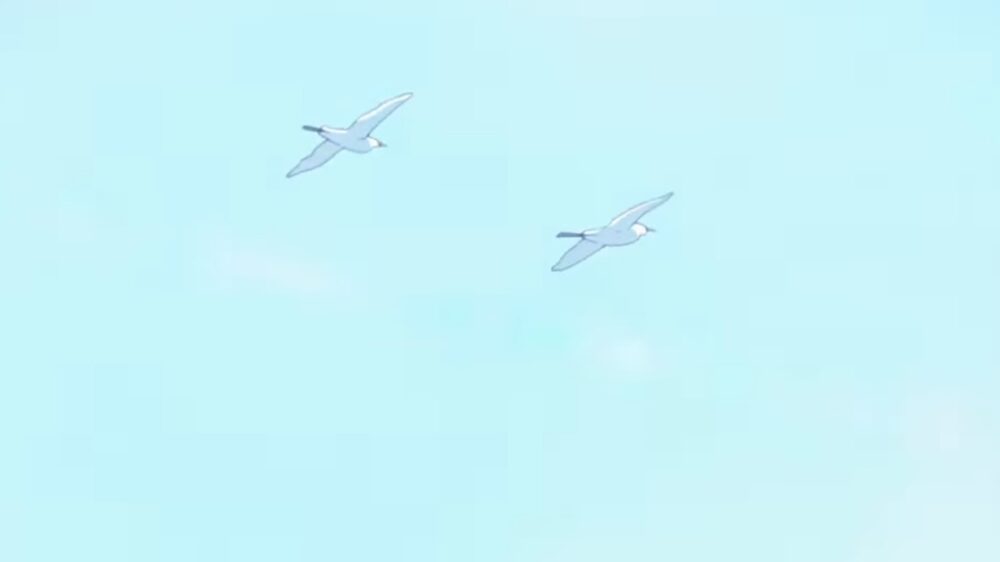 みぞれと希美が大好きのハグをして、いろんな思いをぶつけ合った後、場面が変わり青空に2羽のカモメが飛び立っておりました。